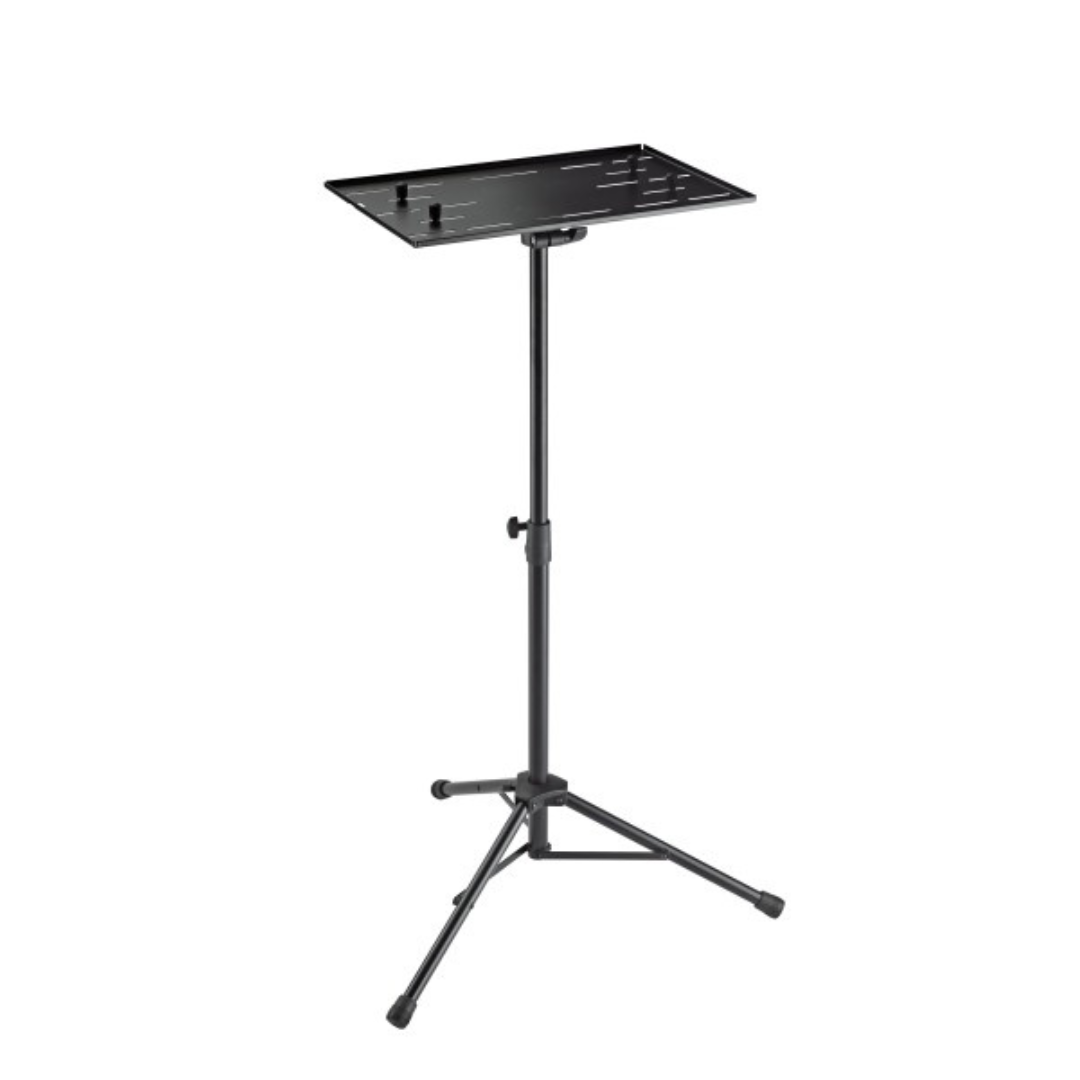 The laptop stand offers stability and safety. The generously sized tray provides space for all common laptops. Thanks to the adjustable clamping bolts with rubber caps, the laptop is protected and can be secured safely on the stand. To secure the laptop, the clamping bolts are pressed on the laptop using wing nuts. An additional hole allows convenient cable management. The height of the stand can be adjusted variably. For transport the tray can be removed easily without the use of tools. The robust tripod legs quickly collapse together into a compact and easy to carry package.