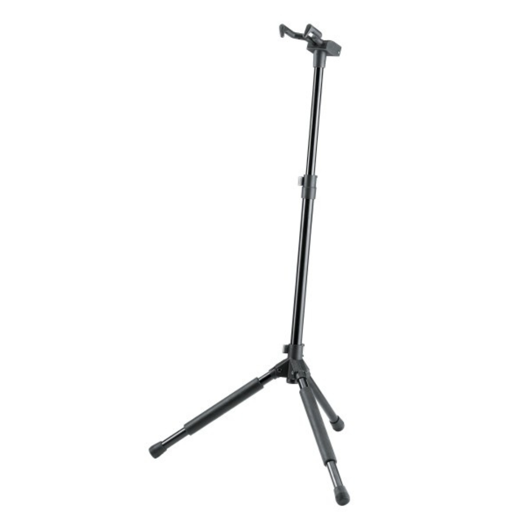Folding stand for all guitars. Features a patented flexible hooking-in and clamping system which quickly and firmly grasps the guitar neck. Fits most instrument necks. Studs at support arms provide extra protection. Height adjustment with convenient locking levers. Anti-twist feature on the extension rod for extra safety. High quality non-marring rubber on the stand’s neck grip and base helps to protect the instrument. Stable robust base.