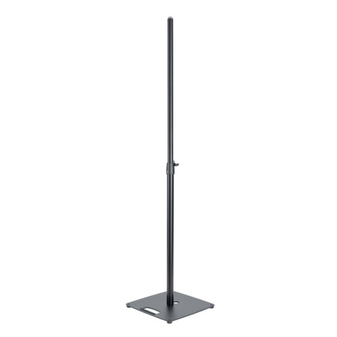 Attractive speaker stand with flat steel plate (406 x 406 mm), useful carrying handle and cable management. The stand is ideal for use where space is at a premium. The height is fixed with a safety hook and secured with a low-noise, backlash-free clamping screw. The slim design of the clamp enables space-saving transportation and ensures a stylish appearance. The usable height is between 1,110 and 1,810 mm and can be reached in 4 steps of 175 mm. The maximum load capacity when fully extended is 18 kg.